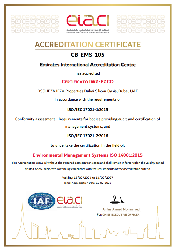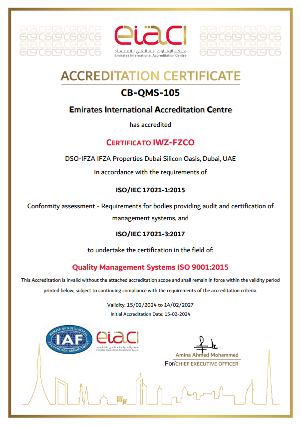 IWZ CERTIFICATE – FZCO operates as an independent Certification Body, headquartered in Dubai (UAE), ACCREDITED by the United Arab Emirates accreditation body EIAC (Emirates International Accreditation Center).